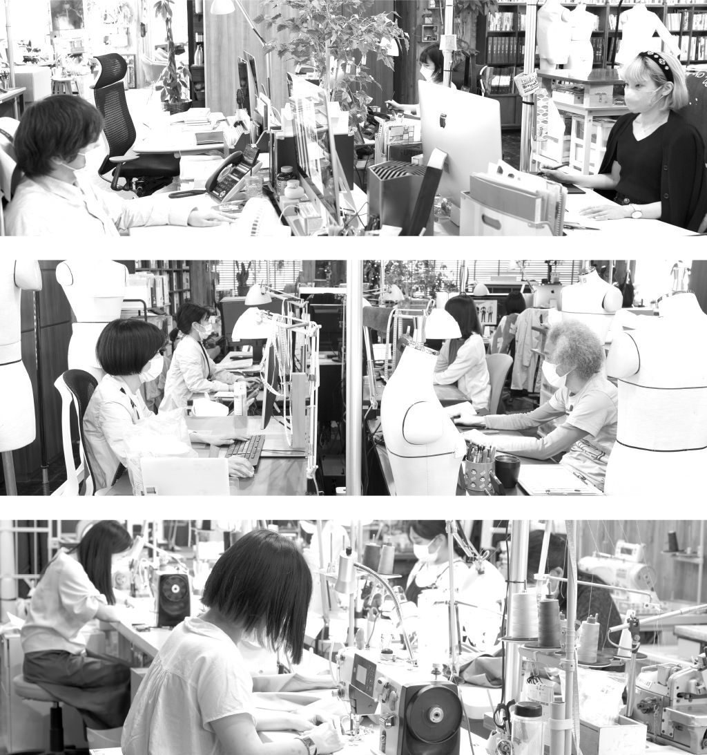 - 社員数 16名 (デザインチーム5名 パターンチーム3名 サンプル縫製チーム6名 総務経理2名)
