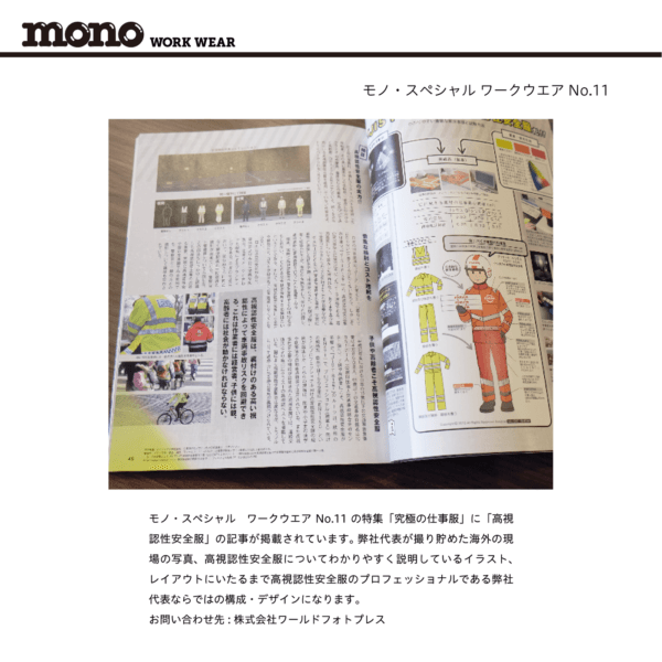 2016年02月27日発売「モノ・スペシャル ワークウェア No.11」の特集「究極の仕事服」に「高視認性安全服」の記事が掲載されました。
