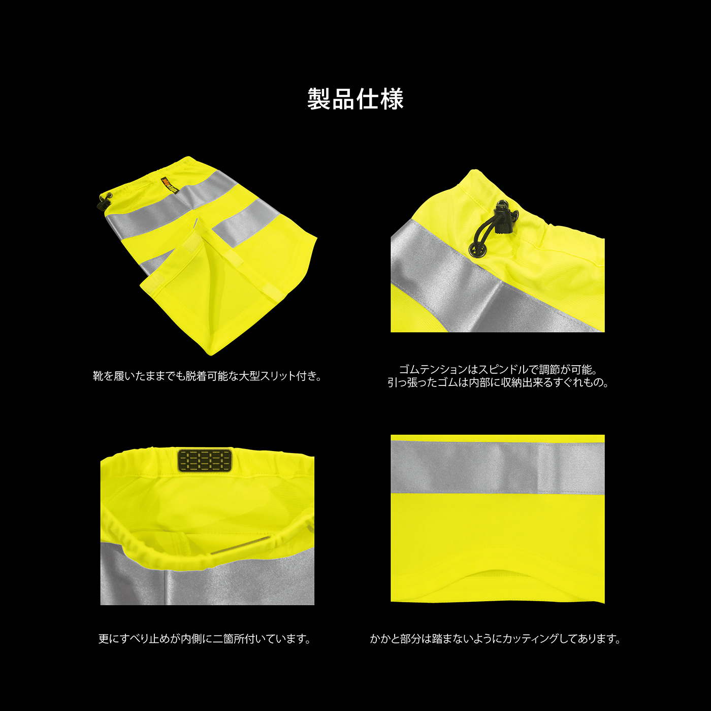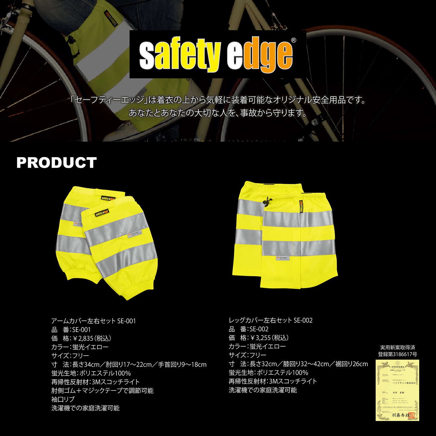 アームカバー左右セット SE-001 品番:SE-001 価格:¥2,835(税込) カラー:蛍光イエロー サイズ:フリー 寸法:長さ34cm、肘回り17~22cm、手首回り9~18cm 蛍光色素材:ポリエステル100% 再帰性反射素材:3Mスコッチライト 肘側ゴム+マジックテープで調節可能 袖口リブ レッグカバー左右セット SE-002 品番:SE-002 価格:¥3,255(税込) カラー:蛍光イエロー サイズ:フリー 寸法:長さ32cm、膝回り32~42cm、裾回り26cm 蛍光色素材:ポリエステル100% 再帰性反射素材:3Mスコッチライト 洗濯機での家庭洗濯可能 実用新案 登録第3186617号