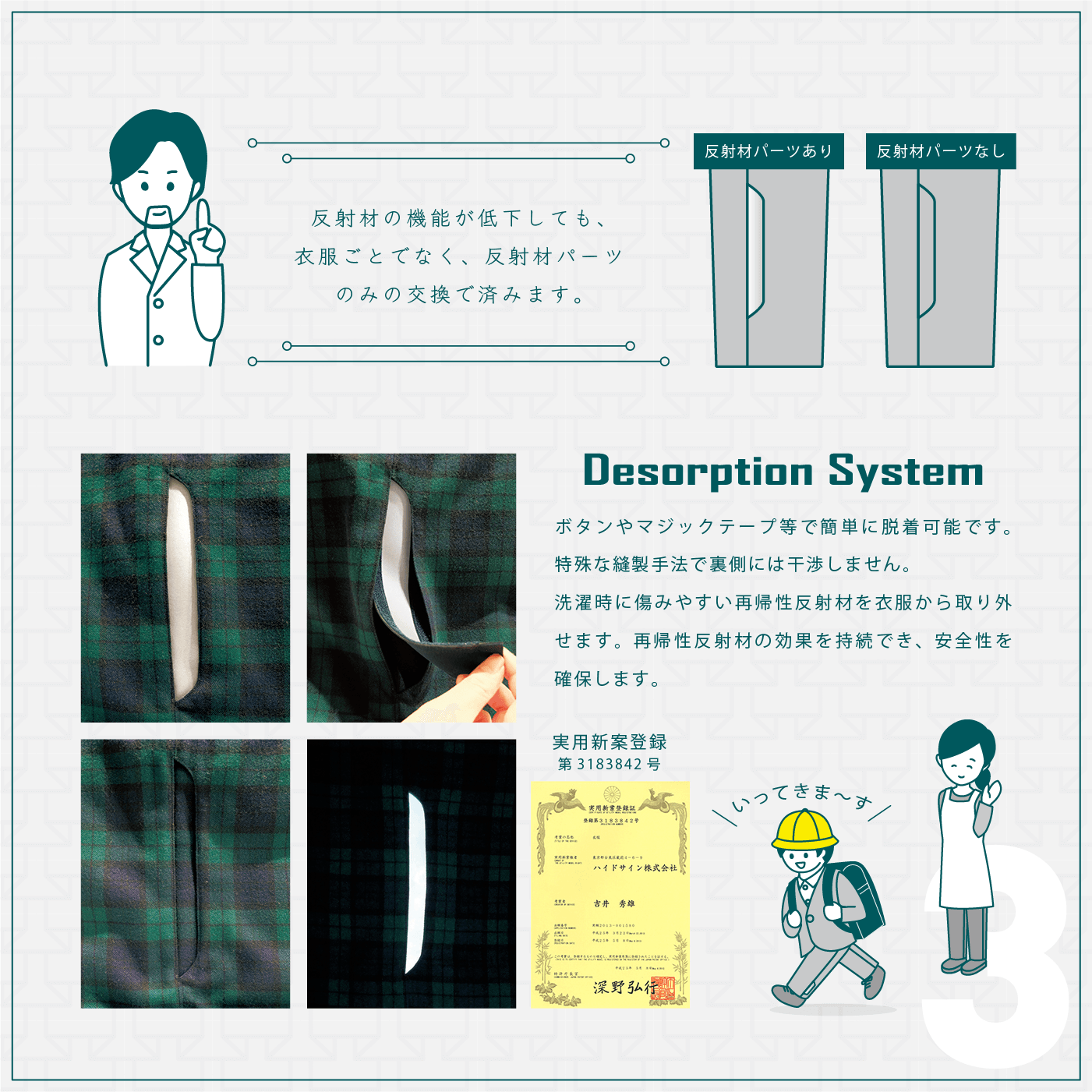 ボタンやマジックテープ等で簡単に脱着可能です。 特殊な縫製手法で裏側には干渉しません。 洗濯時に傷みやすい再帰性反射材を衣服から取り外せます。 再帰性反射材の効果を持続でき、安全性を確保します。