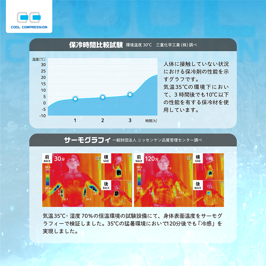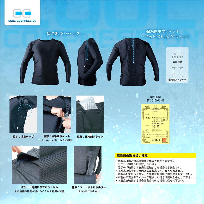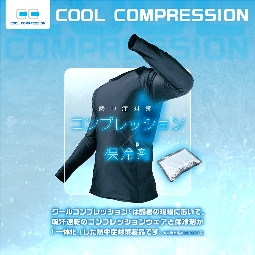 クールコンプレッション®︎は酷暑の現場において、 吸汗速乾のコンプレッションウェアと保冷剤が一体化した 熱中症対策製品です。