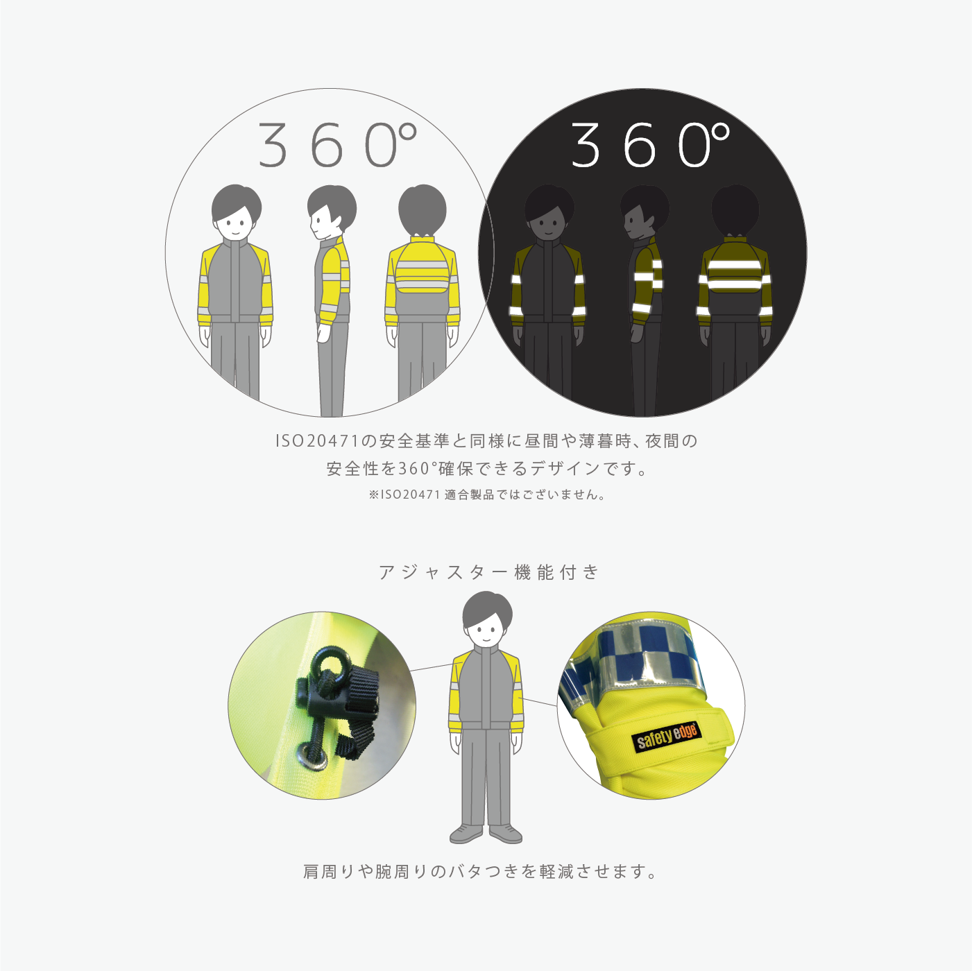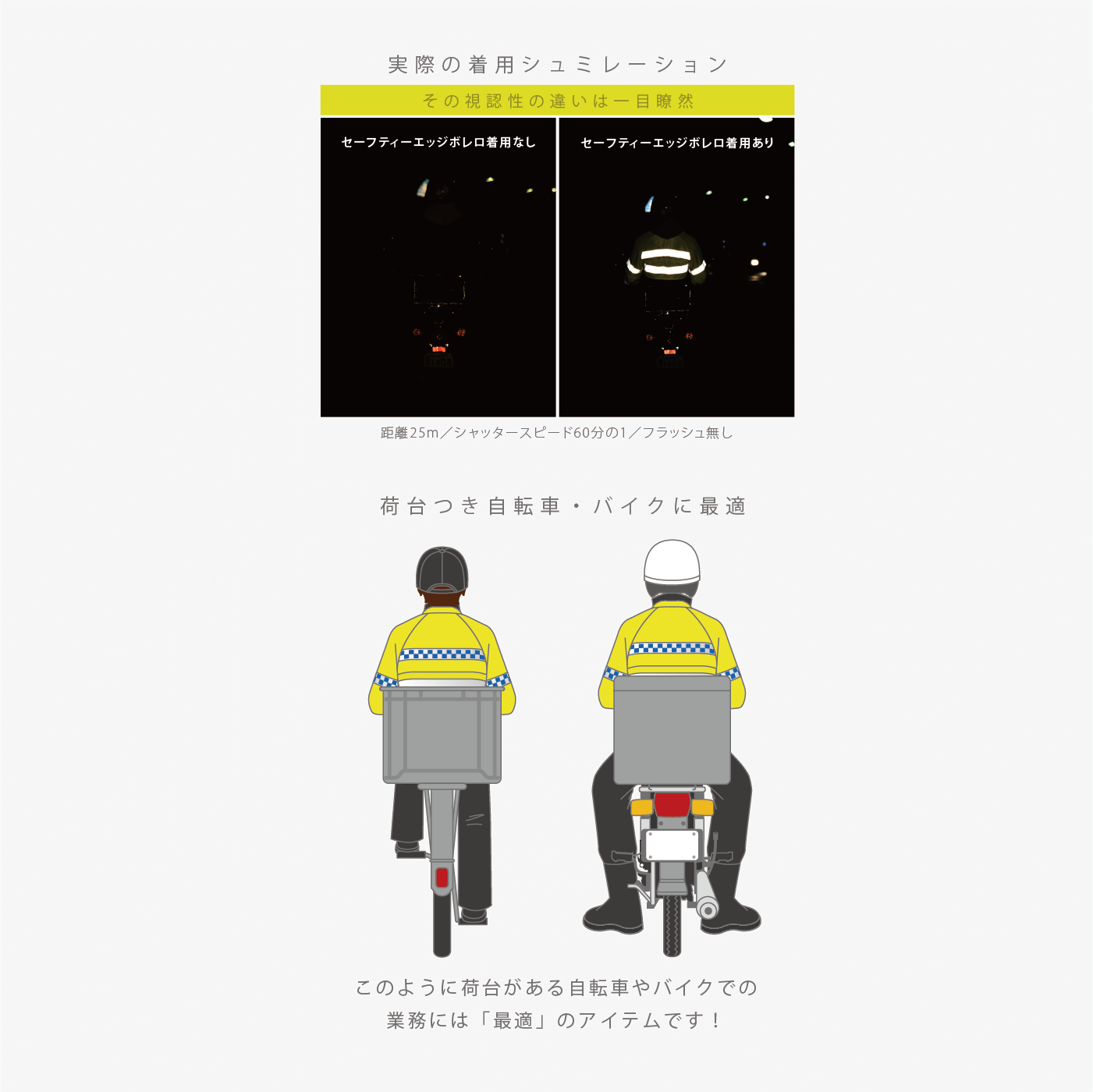 Safety edge ボレロに袖を通す事によって高視認性の安全を獲得出来るのです。