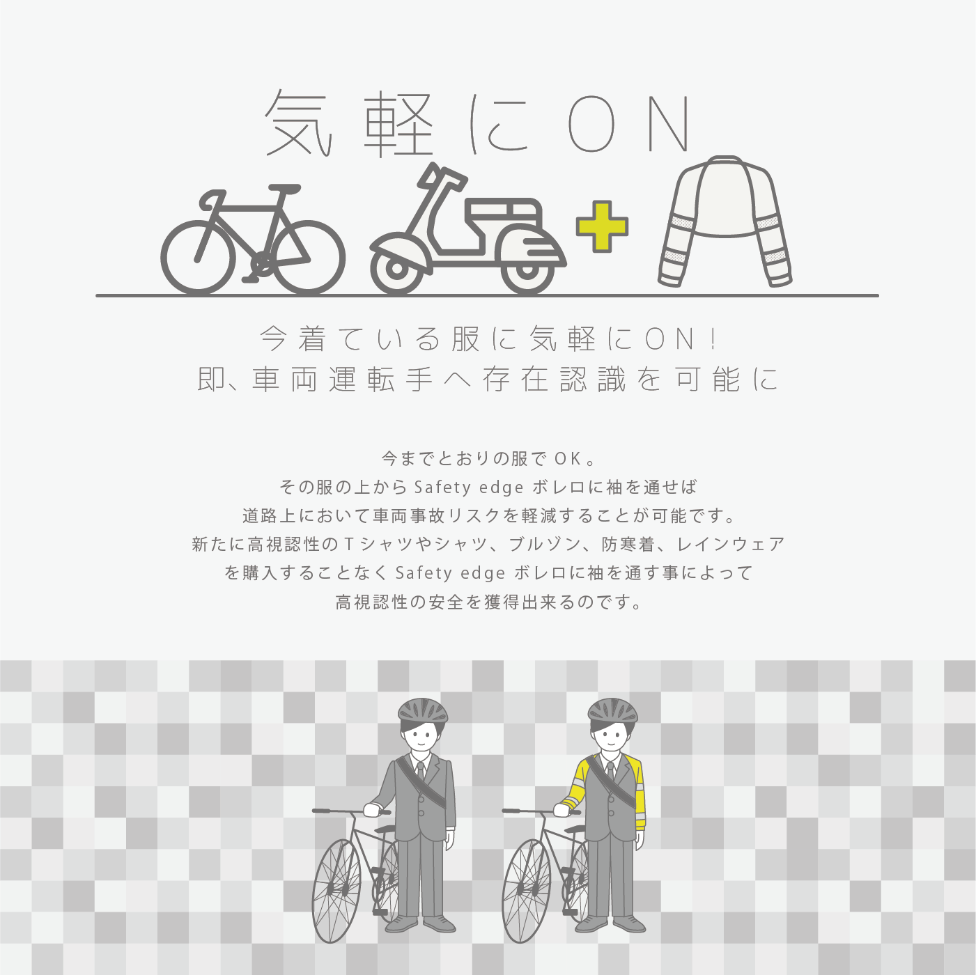 その服の上からSafety edge ボレロに袖を通せば道路上において車両事故リスクを軽減することが可能です。