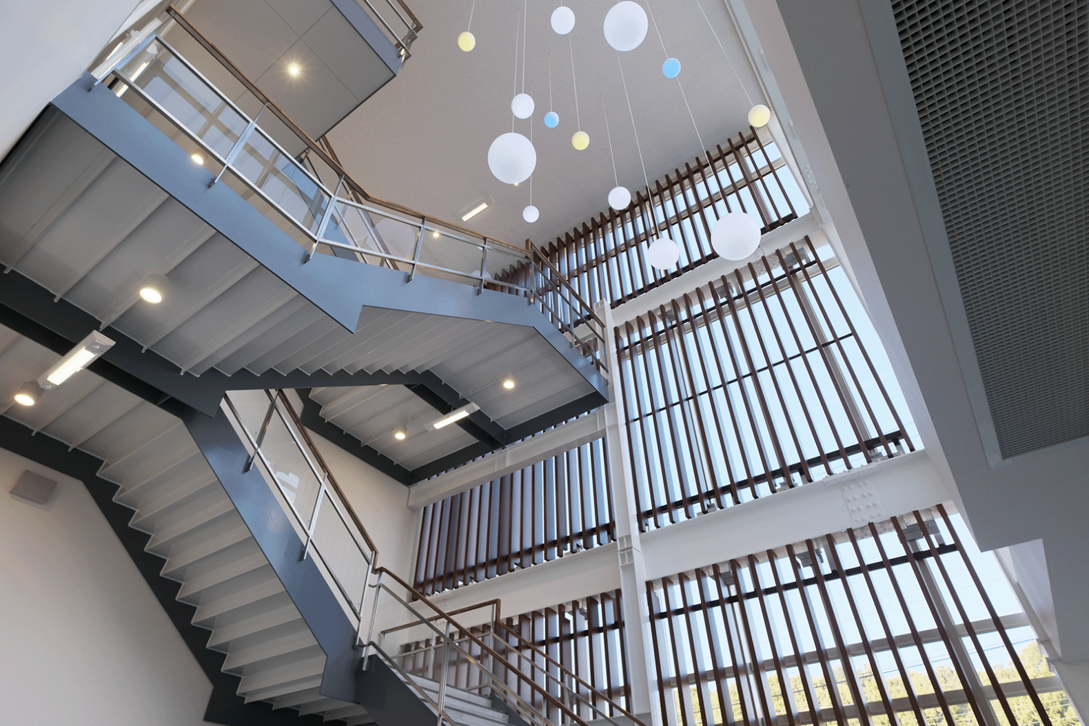 エントランスには解放感のある吹き抜けとほどよく日光を取り込むルーバーを施工。