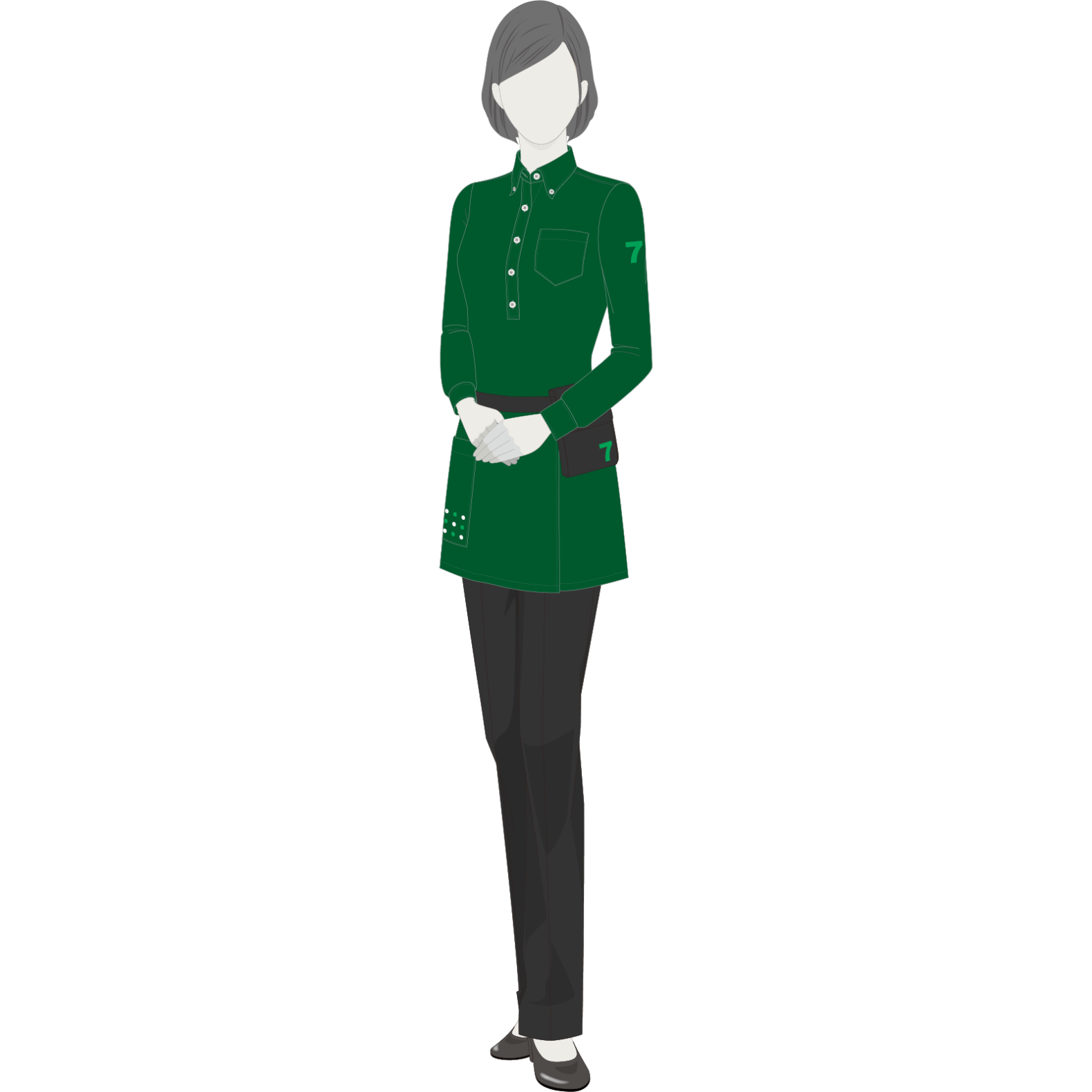 トップスをアウト設定にして同色のエプロンをレイヤード風にコーディネートすることで、体のラインをスッキリさせ、着用する年齢層を問わないデザインとなっています。